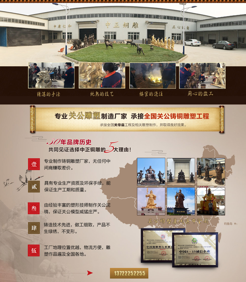 河北中正銅工藝品制造有限公司是一家具有獨(dú)立設(shè)計(jì)、雕塑、鑄造、制作施工能力的單位。擁有完善的,大型的,先進(jìn)的生產(chǎn)設(shè)備,并由多位經(jīng)驗(yàn)豐富的高級(jí)鑄造技師指導(dǎo)生產(chǎn)及制作。公司主要鑄造銅關(guān)公,九龍銅關(guān)公,福建銅關(guān)公,臺(tái)灣銅關(guān)公,關(guān)羽雕塑,鑄銅關(guān)公,銅雕關(guān)公,1米銅關(guān)公,2米銅關(guān)公等,可按客戶提供動(dòng)物銅雕圖片訂做加工銅關(guān)公,九龍銅關(guān)公,做工精美,質(zhì)量保證。